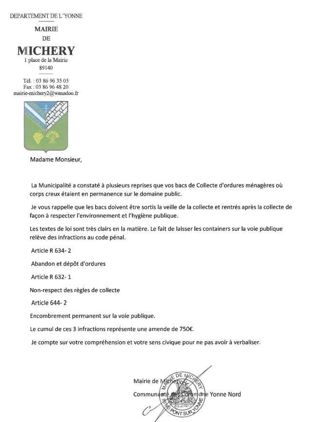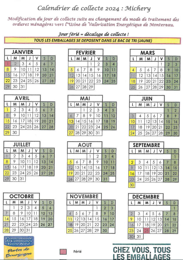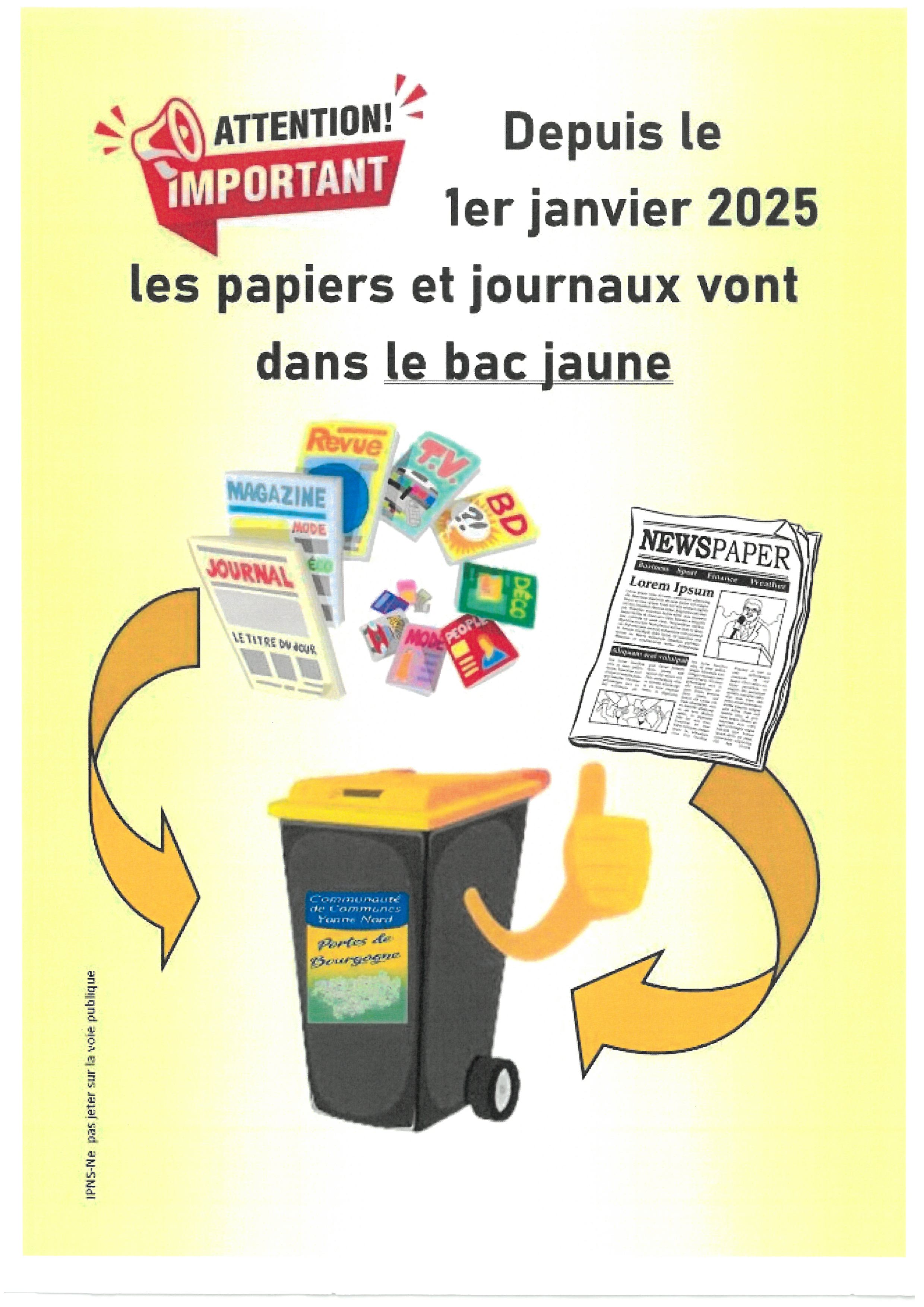 Nous vous rappelons que la déchetterie est gérée par la CCYN (Communauté de Communes). Vous pouvez les joindre au 03 86 67 99 00.