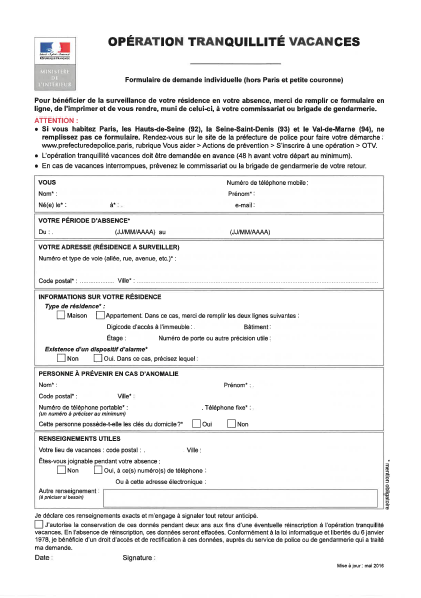 Partez en vacances avec plus de tranquillité en informant la gendarmerie de votre déplacement. Formulaire ci-dessous à remplir et à apporter ou envoyer à la gendarmerie de Pont sur Yonne. Tel: 03 86 67 11 17