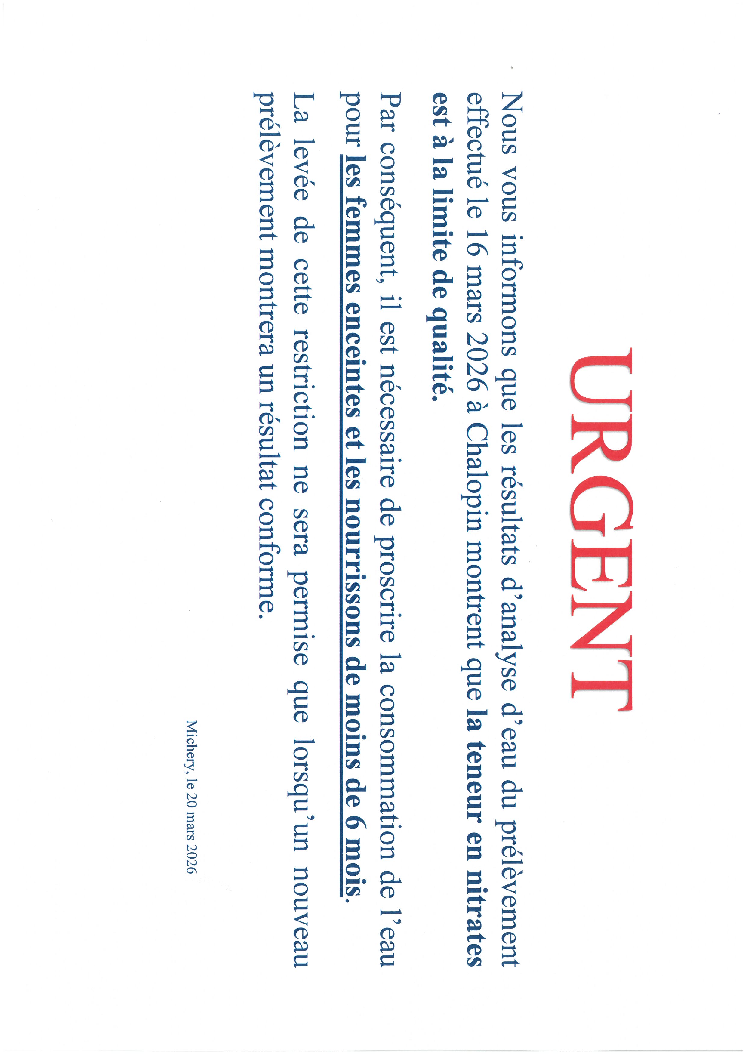 Le taux de nitrate de l'eau de Chalopin est revenu à la normale, en conséquence, elle est à nouveau consommable pour les nourrissons et les femmes enceintes.